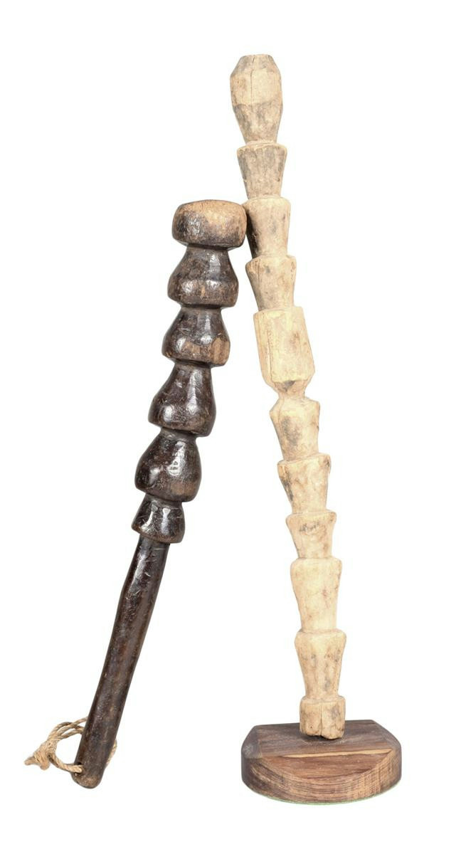 A Dogon shrine object/staff, Mali, of stepped tapering conical form, 43cm high, on a stand, and a similar staff with a pierced handle with fibre loop, 37.5cm long. (2)