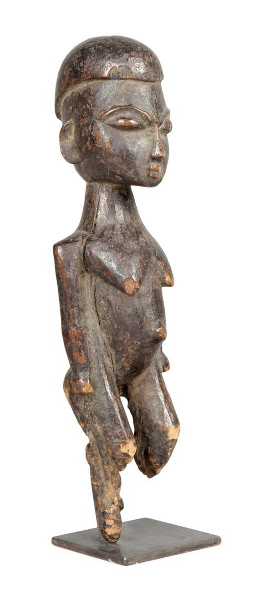 A Lobi standing pregnant female figure, Burkina Faso, with pointed coiffure, the legs with termite damage, 20cm high, on a stand.