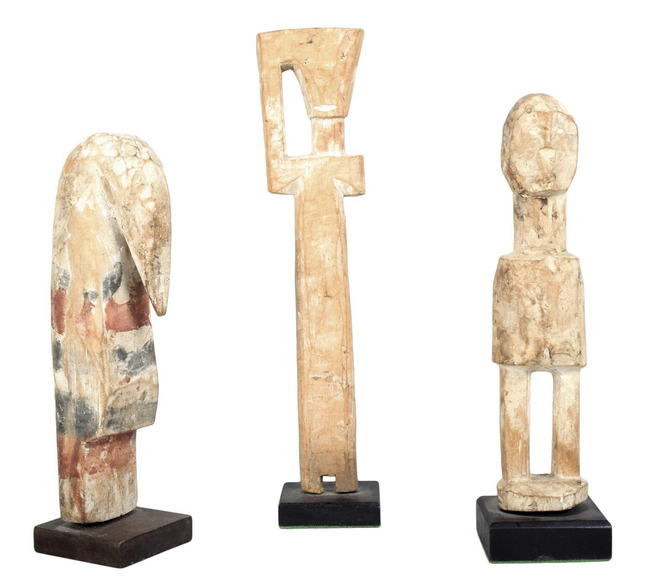 An Adan standing figure, Ghana, of abstract form with right arm raised to the head, traces of white pigment, 21cm high, on a stand, an Adan armless standing figure, 17.5cm high, on a stand, an Adan bird, with a white pigment ground with black and red stripes, 16.5cm high, on a stand. (3)