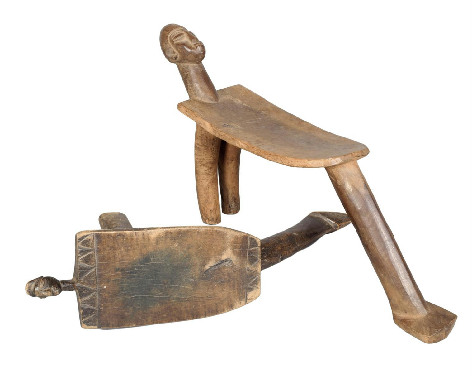A Lobi stool, Burkina Faso, the seat with chevron ends and a carved head head wearing a cap, 14.5cm high, a Lobi stool, with a dished seat and a carved head, 28.5cm high. (2)