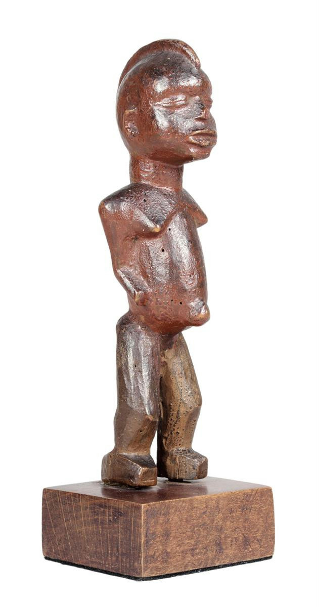 A Lobi standing female figure, Burkina Faso, with a single crest and handless arms to her side, the torso with a red pigment, 15.5cm high, on a stand.
