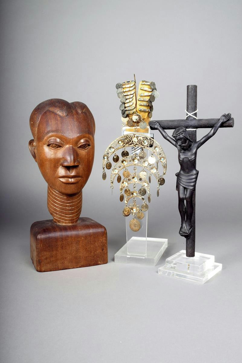 An African ebony Corpus Christi, the crucifix 37cm high, a gilt metal necklace, 42cm high and a carved wood head, 38.5cm high. (3)