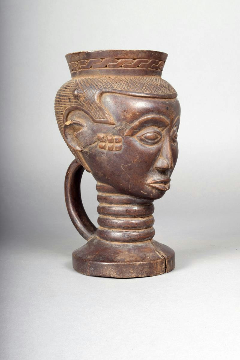 A Kuba anthropomorphic wine cup, D R Congo, with diced coiffure, scarifications and a ringed neck, with handle, 26cm high.
