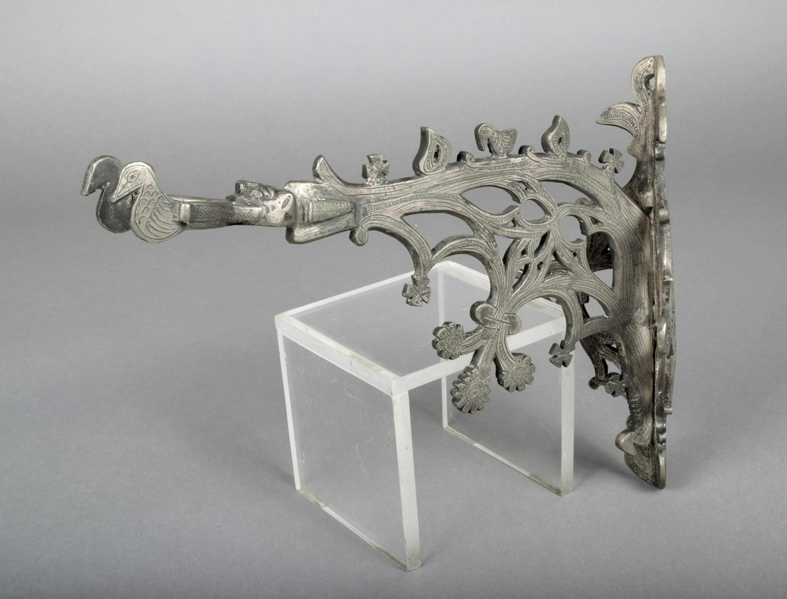 An Ethiopian silver coloured metal bracket for an incense burner, pierced and engraved with birds, flowerheads, crosses and an animal head terminal, 22cm high, 26.5cm long.