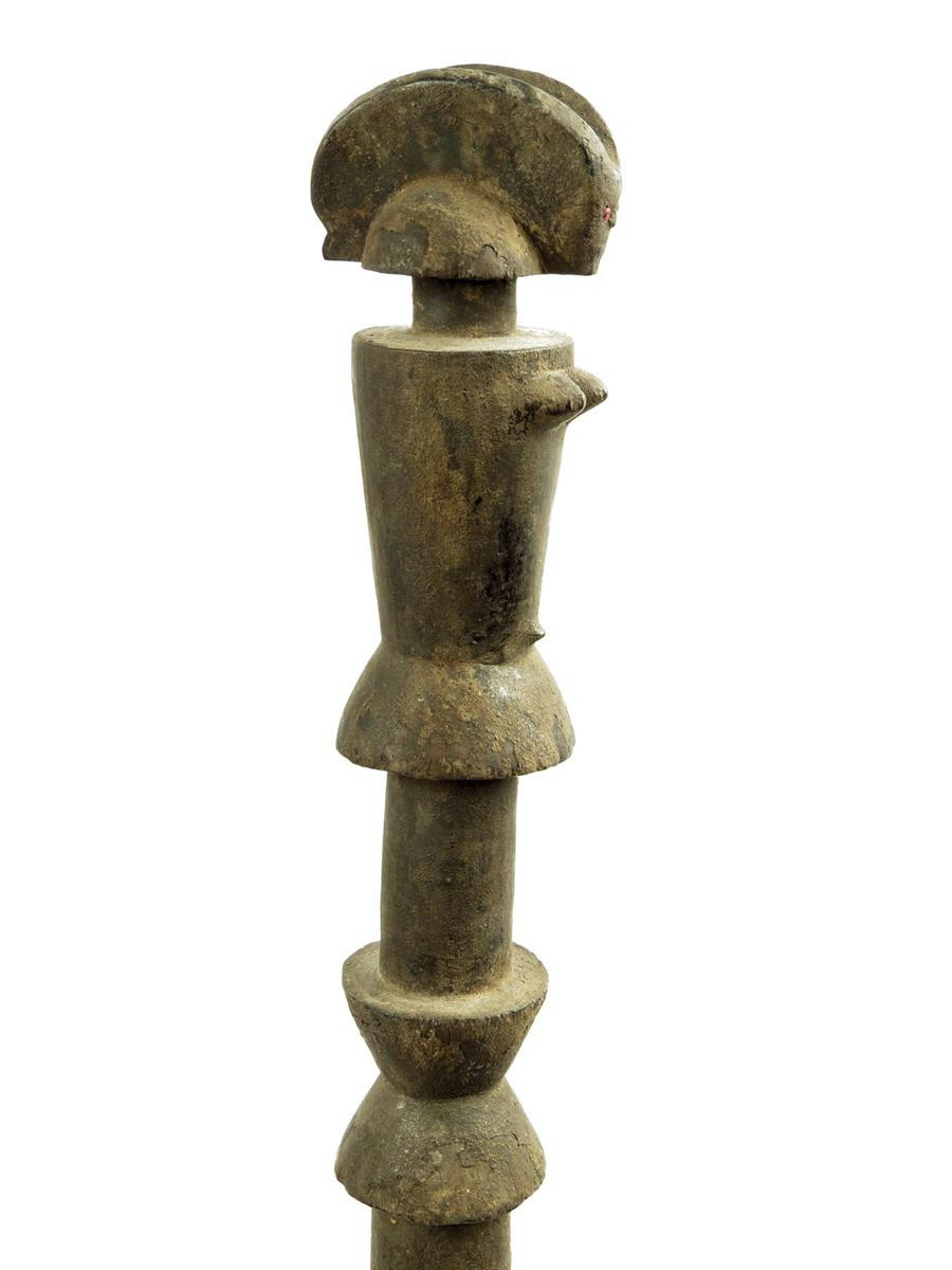 A Tanzanian staff, with stylised female figure terminal, inset bead eyes, with black encrusted patination, 107.5cm high and later stand.