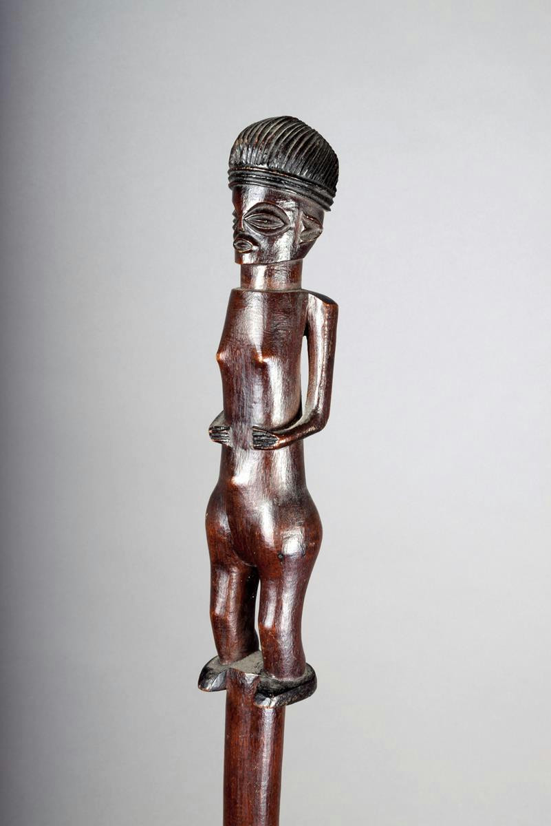 A Chokwe staff, Angola, carved a standing figure with grooved coiffure, 100cm high, on a stand.