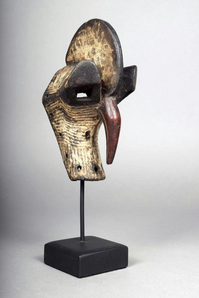A Songye passport mask, D R Congo, of kifwebe type with central crest, protruding eyes and a beak, 18cm high, on a stand.