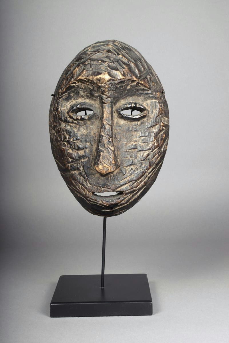 A Lega hunting mask, D R Congo, wood with a textured finish and pierced holes around the base, 32cm high, on a stand.