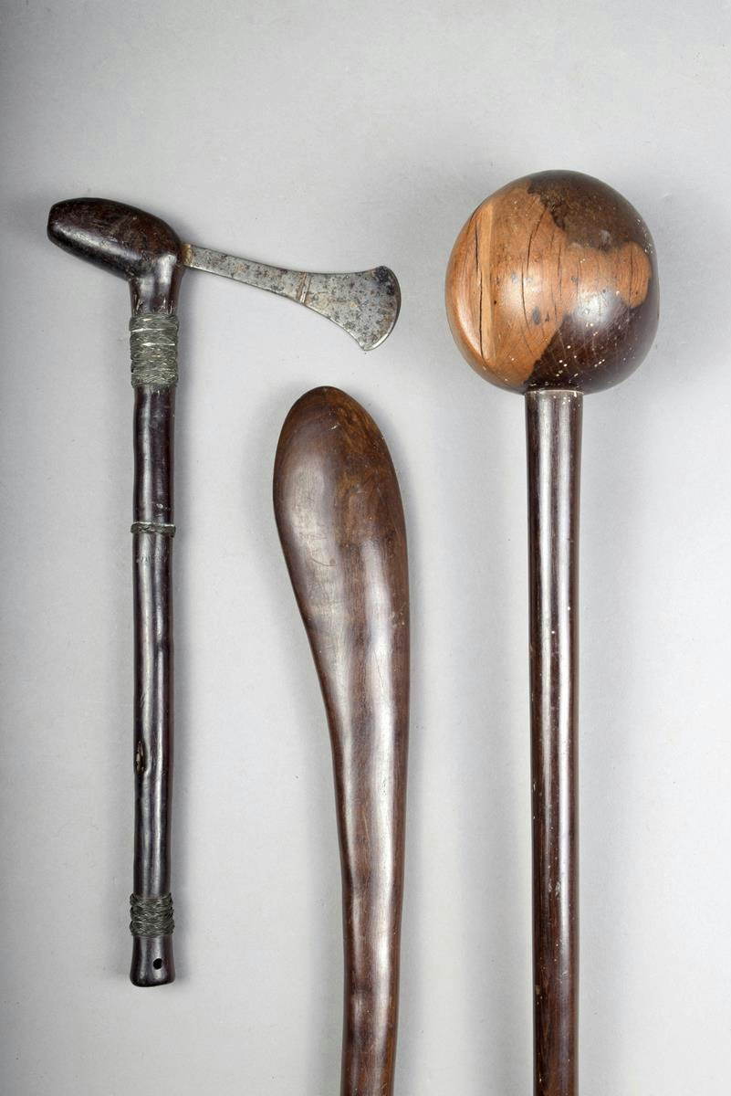 A South African knobkerrie, with a spherical head having a gouge, 63cm long, an East African adze, with a crescent end blade with a ridge and wirework bound handle, 37.5cm long, and a club with flattened head, 65cm long. (3)