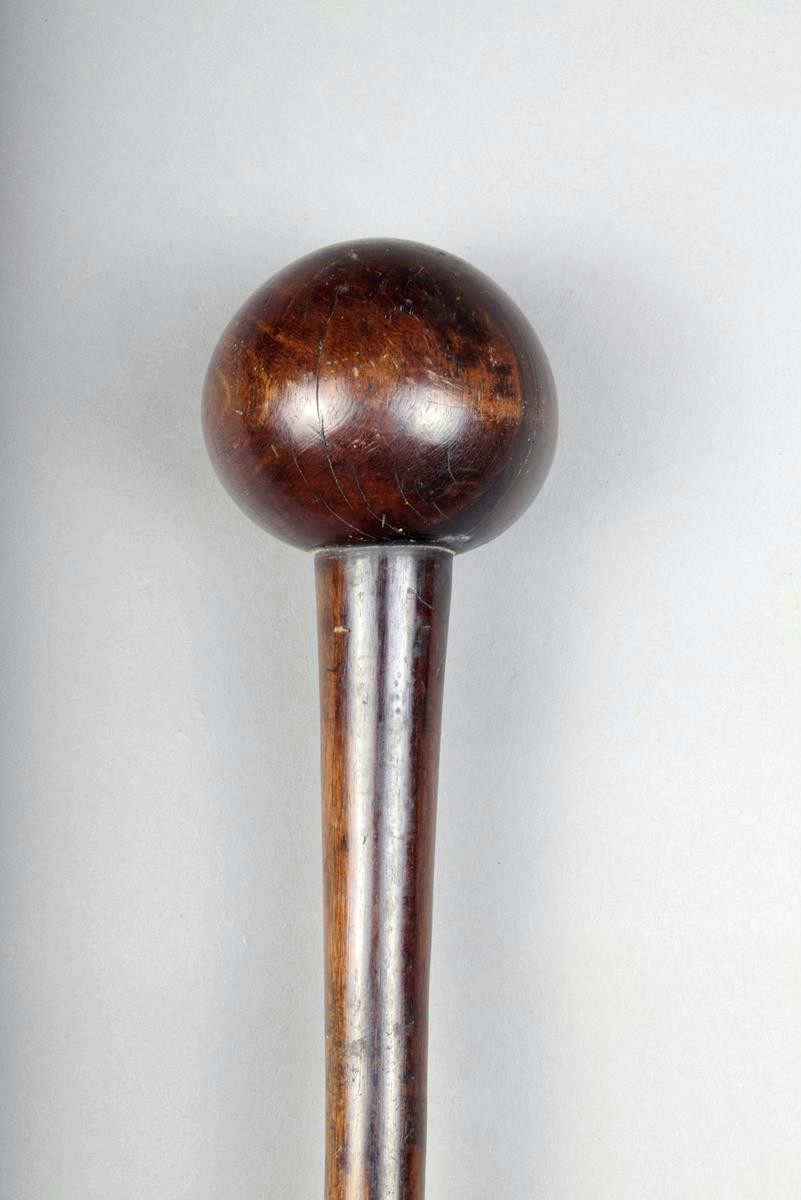 A South African knobkerrie, with a spherical head and waisted tapering handle, 71cm long.