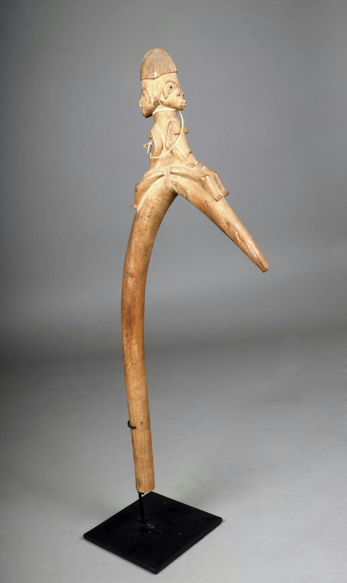 A Lobi staff, Burkina Faso, with a double seated figure surmount, reduced, 62.5cm high.