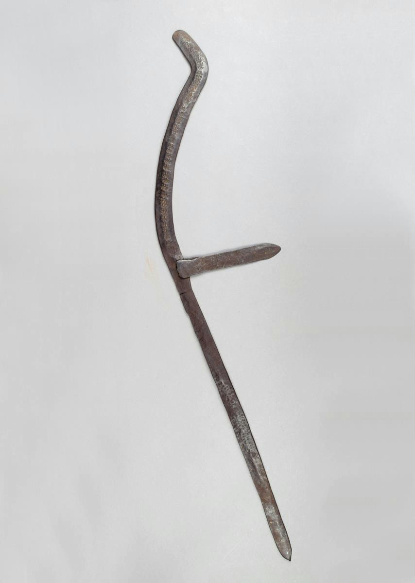 An African iron throwing knife, one part with stamped pattern, 77cm long.