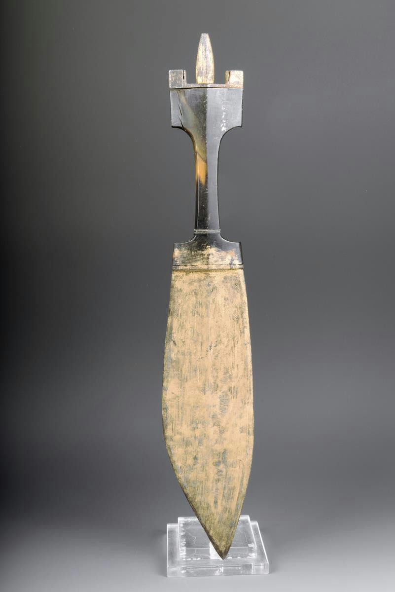 A Somali billao dagger, with an asymmetrical blade, horn handle and triple point pommel, later gilt, 41.5cm long.