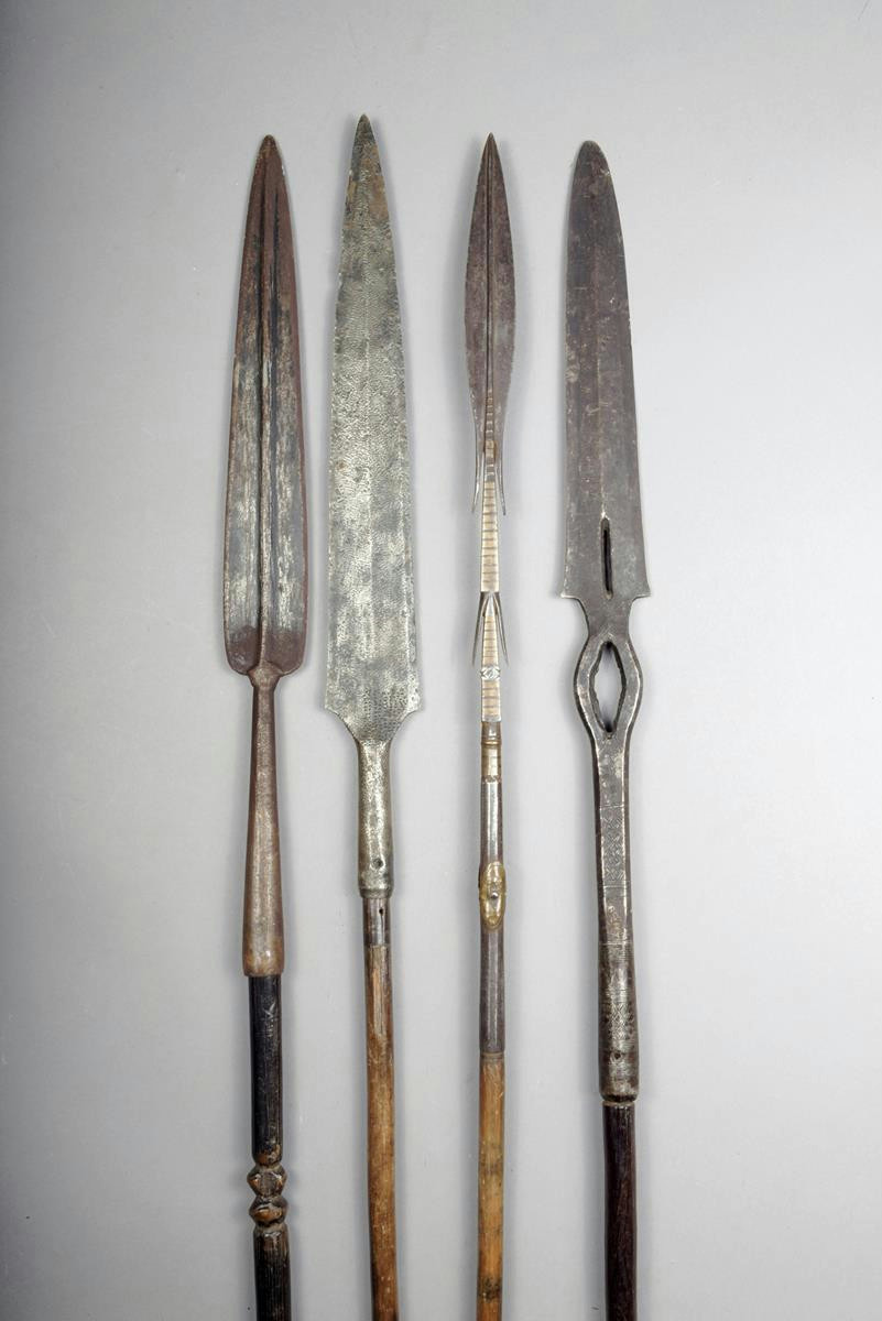 A Kuba spear, with a pierced blade and facetted socket with incised decoration, with wood shaft and long metal spike tip, 150cm long, a Tuareg spear, with fish tail blade and brass overlay, on a wood shaft with shhet metal and a flattened metal tip, 182.5cm long, a Congo spear with knopped wood shaft and pointed metal tip and another African spear. (4)