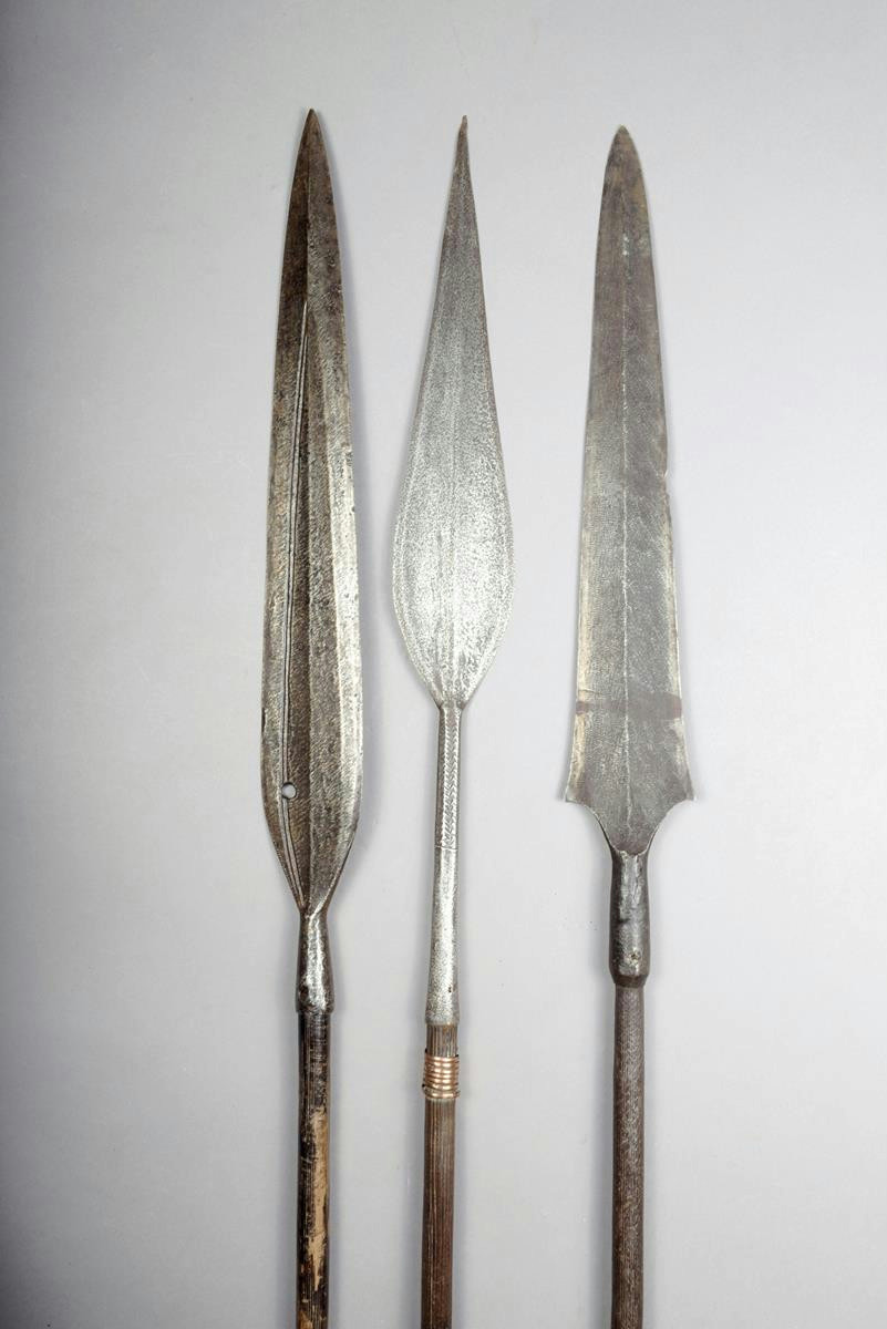 A Congo spear, with leaf shape bade and chevron incised socket on a wood shaft with fine incised lines and a swollen section towards the tip with coiled copper, 203cm long, a Congo spear with incised shaft and a Kuba spear, the tip with a pierced hole. (3)