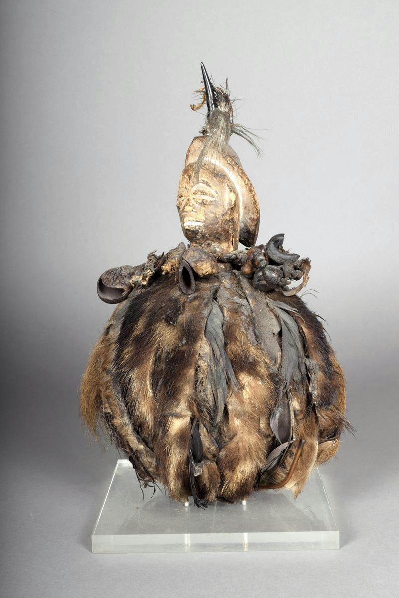 A Tsogo fetish, Gabon, with a spherical body covered in fur and feather, a necklace with bones, nut shells, a claw and fibre, with a carved head with eliptical headdress issing a horn and further feathers and fibre, 36cm high, on a perspex stand.
