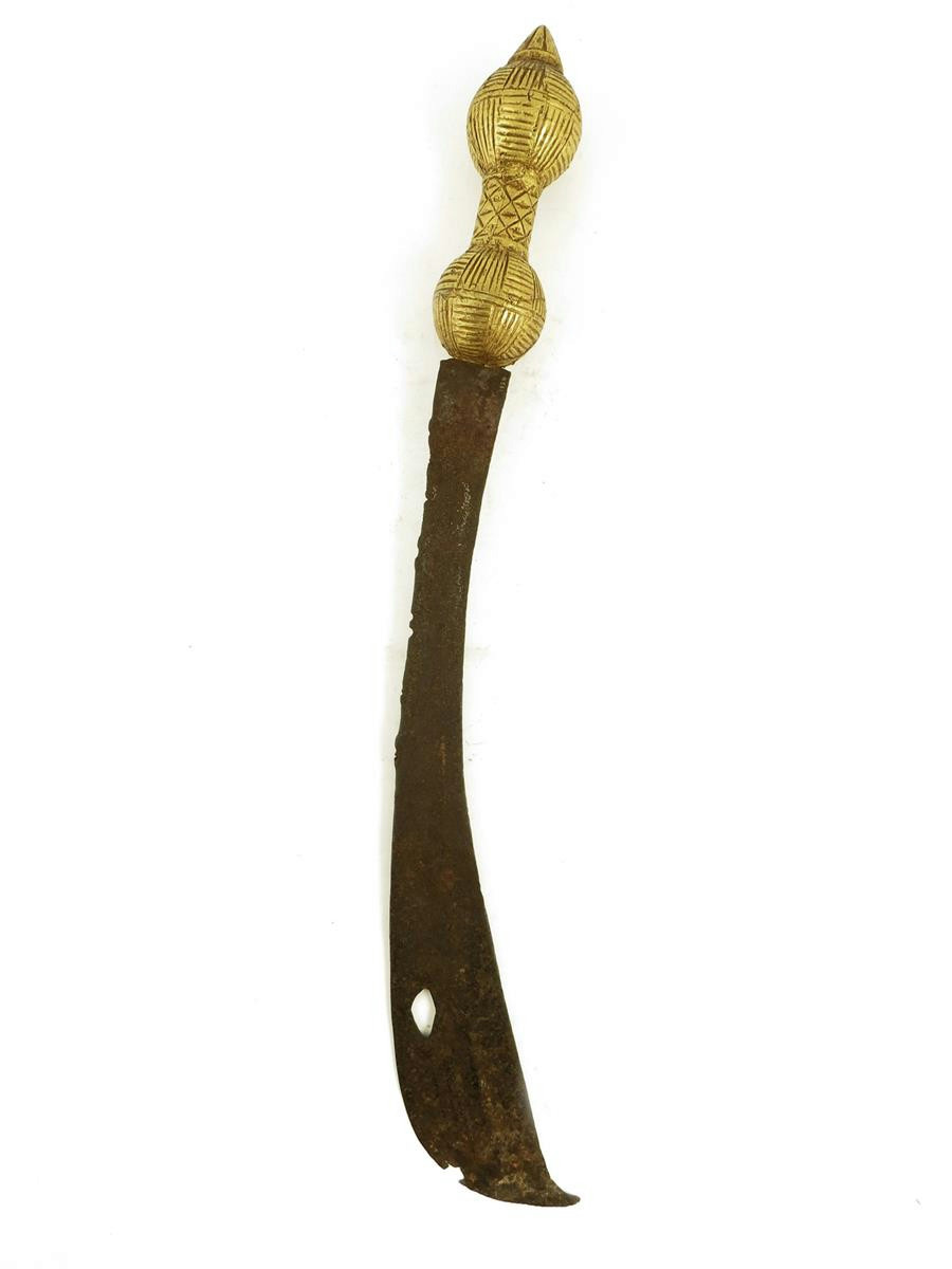 An Ashanti knife, with a curved, fullered and pierced blade, with a gilt sheet covered wood double ball handle, 69.5cm long.