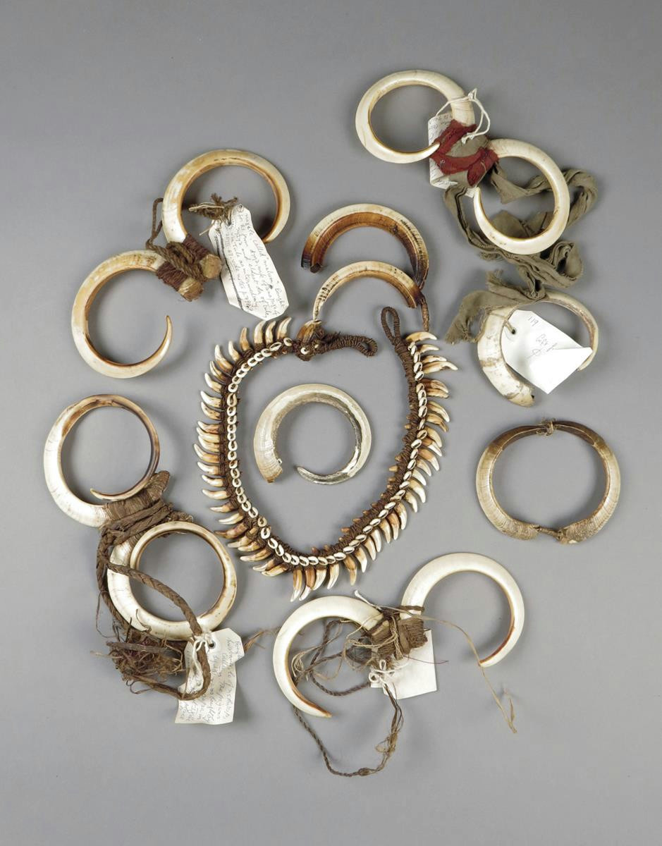 Four Kilenge pig's tusk ornamants, Papua New Guinea, three fibre bound, the fourth cloth bound, the widest 22cm, a pig's tusk armband, four individual tusks and a Kilenge dog's teeth head band, with shells and fibre. (10)