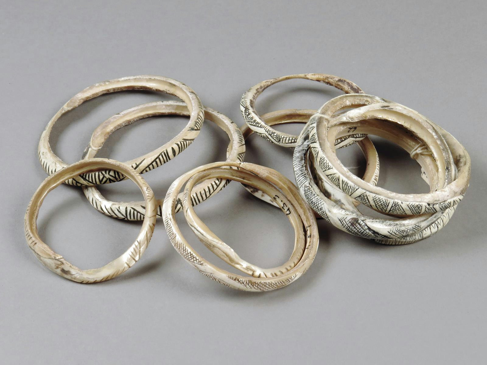 A group of Kilenge shell bracelets, Papua New Guinea, with incised and filled patterns, the largest 10.4cm diameter. (11)