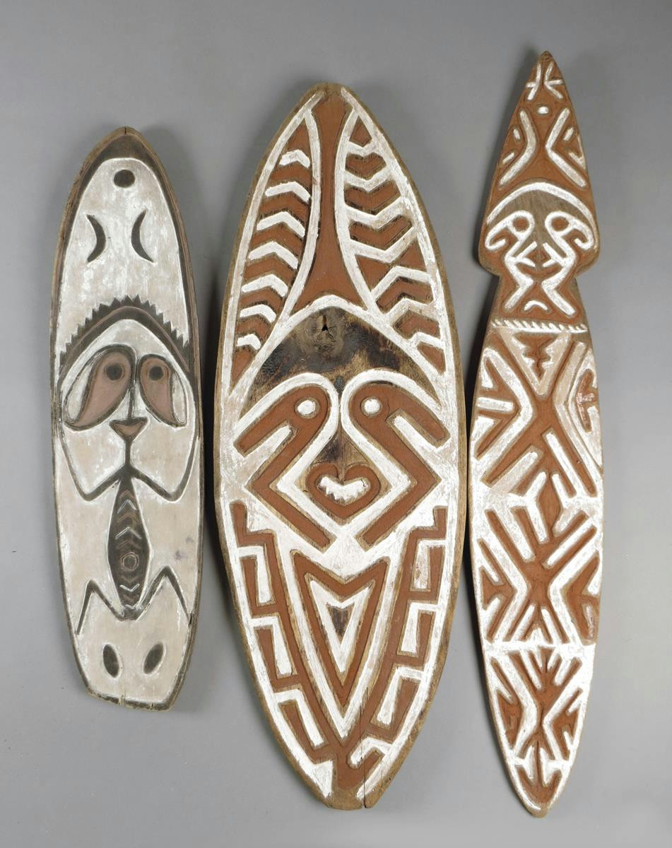 A Papua New Guinea gope board, eliptical, carved a mask and with geometric patterns, red, black and white pigment, 83cm high, a gope board carved an ancestor figure, with pigment decoration, 68.5cm high and a third carved a mask with patterns, 88cm high. (3)