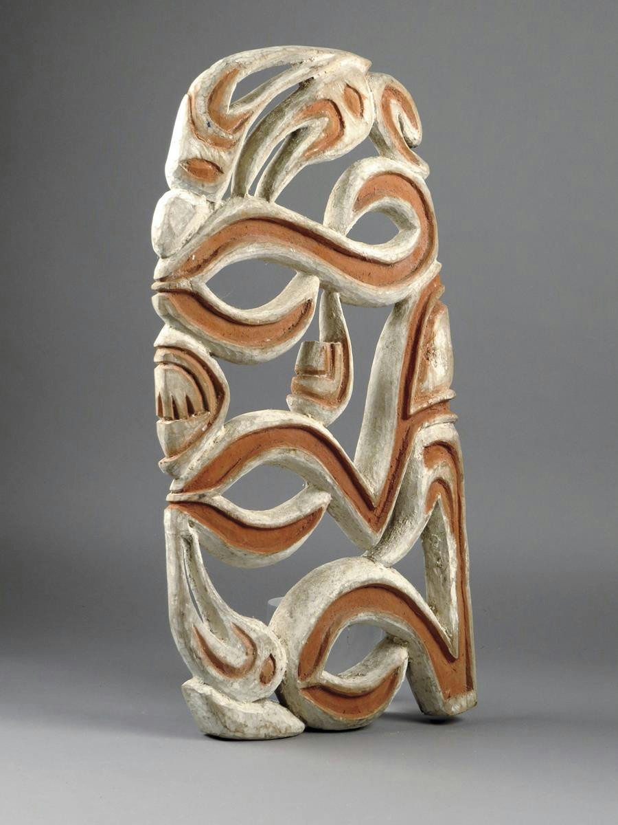 An Asmat carved wood canoe prow ornament, Papua New Guinea, with bird's heads and scrolls with white and red ochre pigment, 56cm high.
