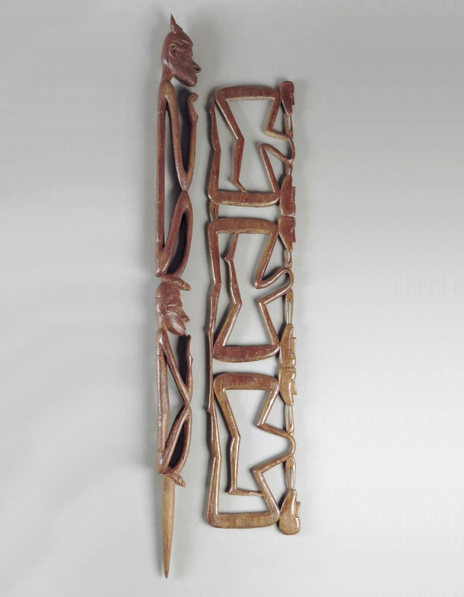 An Asmat carved ornament, Papua New Guinea, with two seated figures, 102cm high, another ornament with six figures, 82.6cm high. (2)