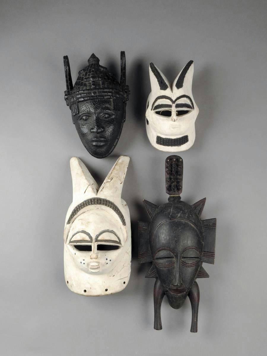 An Ekpo mask, Nigeria, with horned headdress to a circular face with scarifications, with a white pigment finish, 33cm high, a smaller similar mask, a Senufo mask and a Benin carved ebony head. (4)