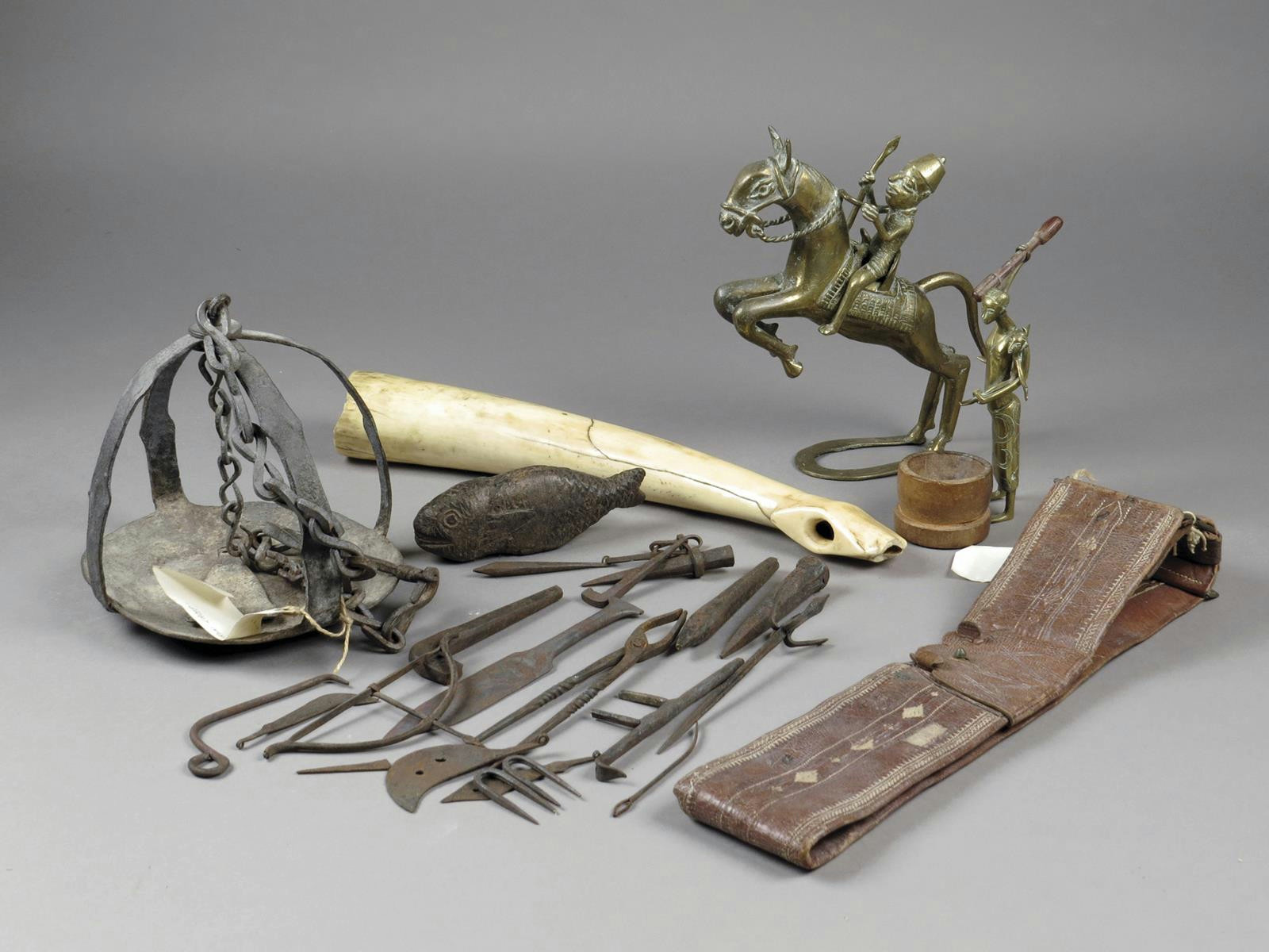‡ A Dahomey brass figure, holding a child whilst pounding, 17.5cm high, a brass equestrian figure, a 19th century ivory oliphant, 38cm long, a Nigerian iron hanging lamp, a Nigerian carved wood fish, a small group of Benin iron work and a North African leather belt with brass clip.