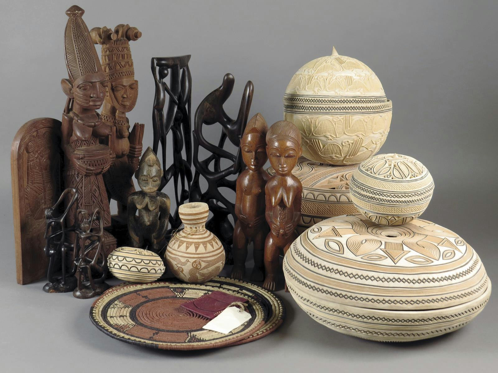 Five Nigerian carved calabashes, as a circular bowl and cover, 35.5cm diameter the largest, a carved calabash vessel, two table mats, a Yoruba carved maternity figure signed L. O. Fakeye, 51cm high, another of a male signed Gani. Fakeye, four Makonde abstract carvings, a Senufo standing female figure and a Benin style carved plaque. (a lot)
