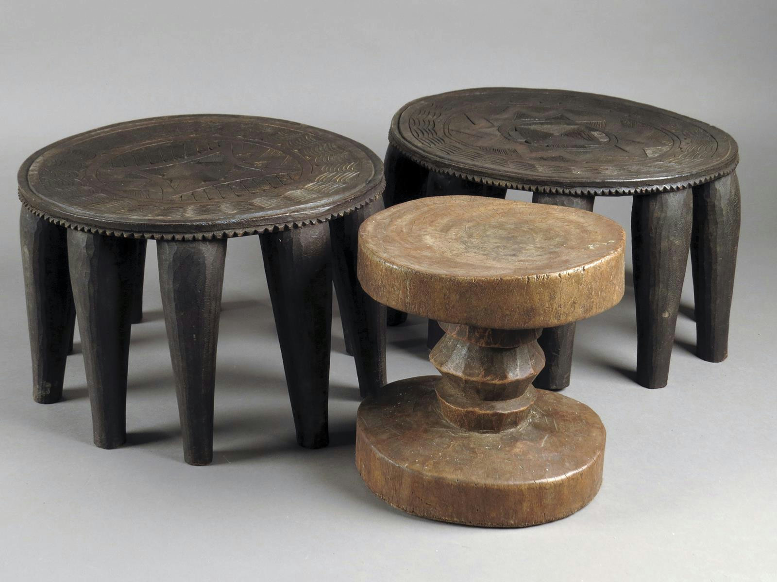 A Nupe stool, Nigeria, with a geometric carved circular top, with ten legs, 21cm high, another similar Nupe stool and a Nigerian knopped stem stool, 224cm high. (3)