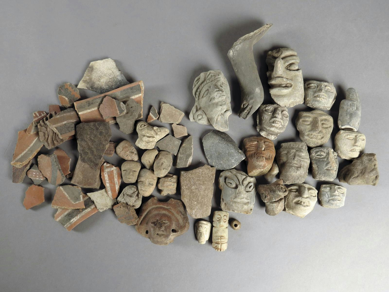 A small collection of pre-Columbian pottery fragments, including masks, a figural amulet, 4.5cm high. (a lot)