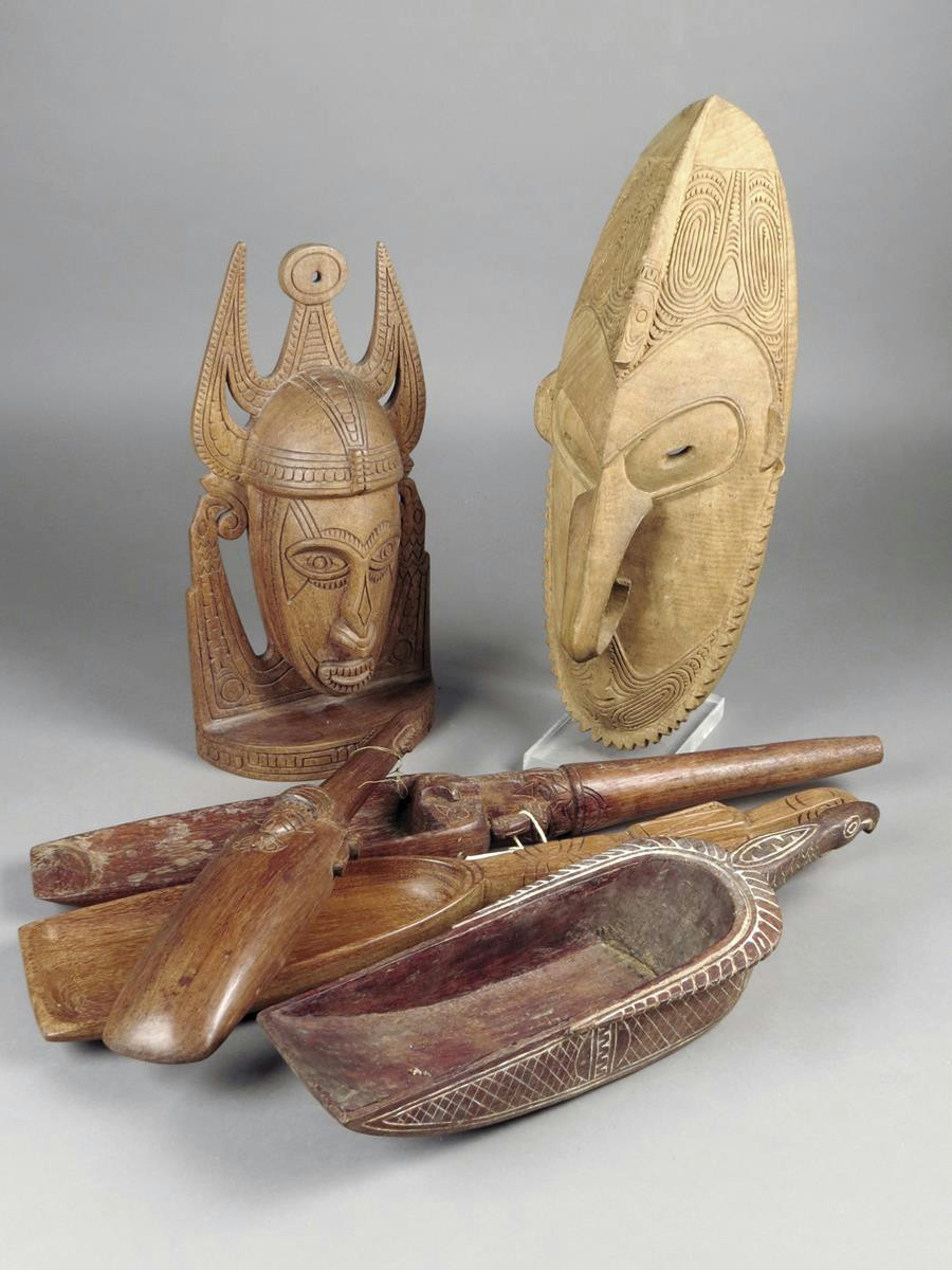 Three Tami Island spoons, Papua New Guinea, carved masks and a bird, the longest 16cm, a Kilenge bailer with bird head handle, 43.5cm long, a Sepik mask and a Tami Island head ornament, 38cm high. (6)