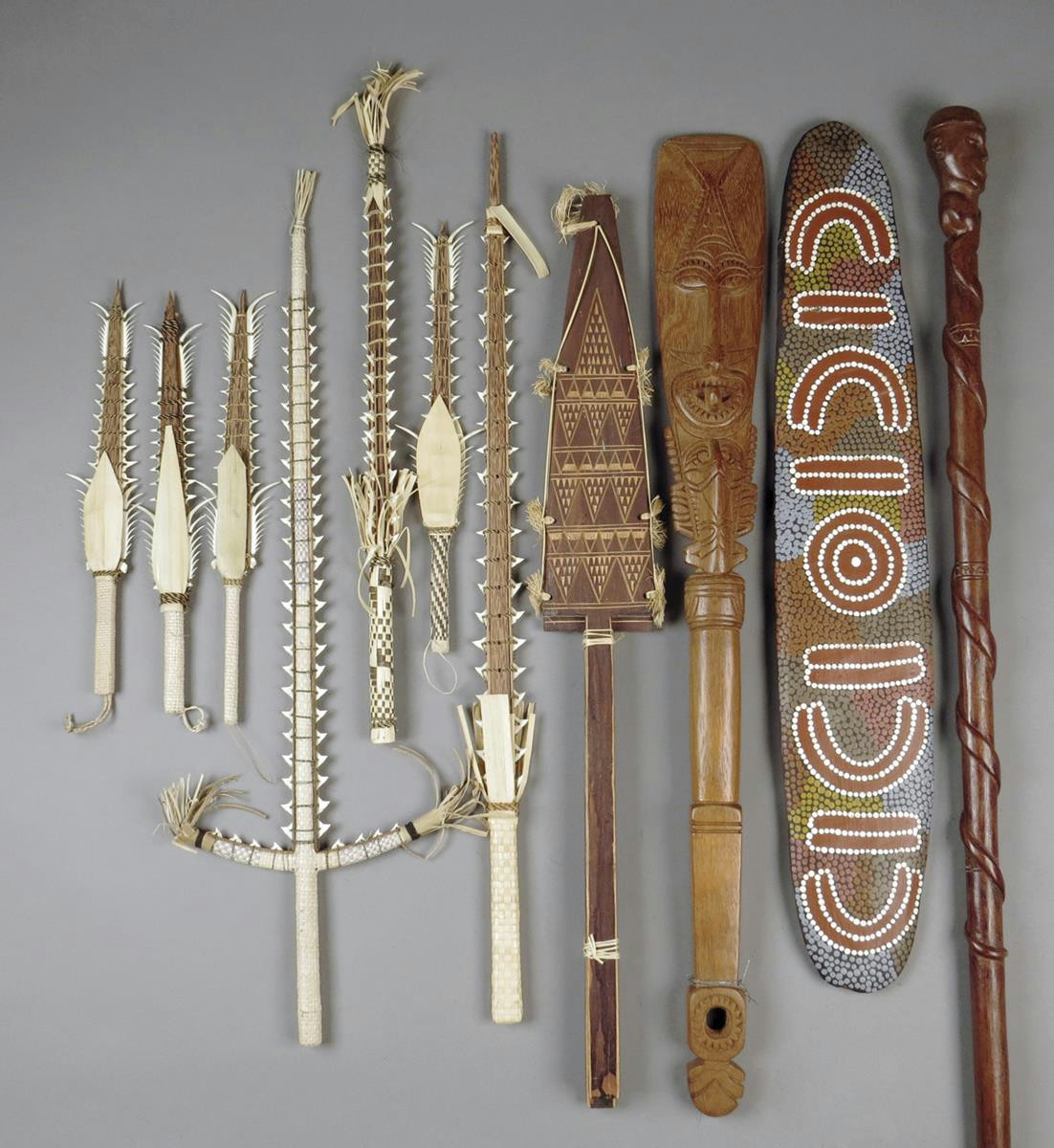A shark's tooth and woven fibre sword, 61cm long, six similar shorter ornamental swords, a Tami Island spoon, a carved walking stick, an Aborigine decorated board and two ornamental paddles. (12)