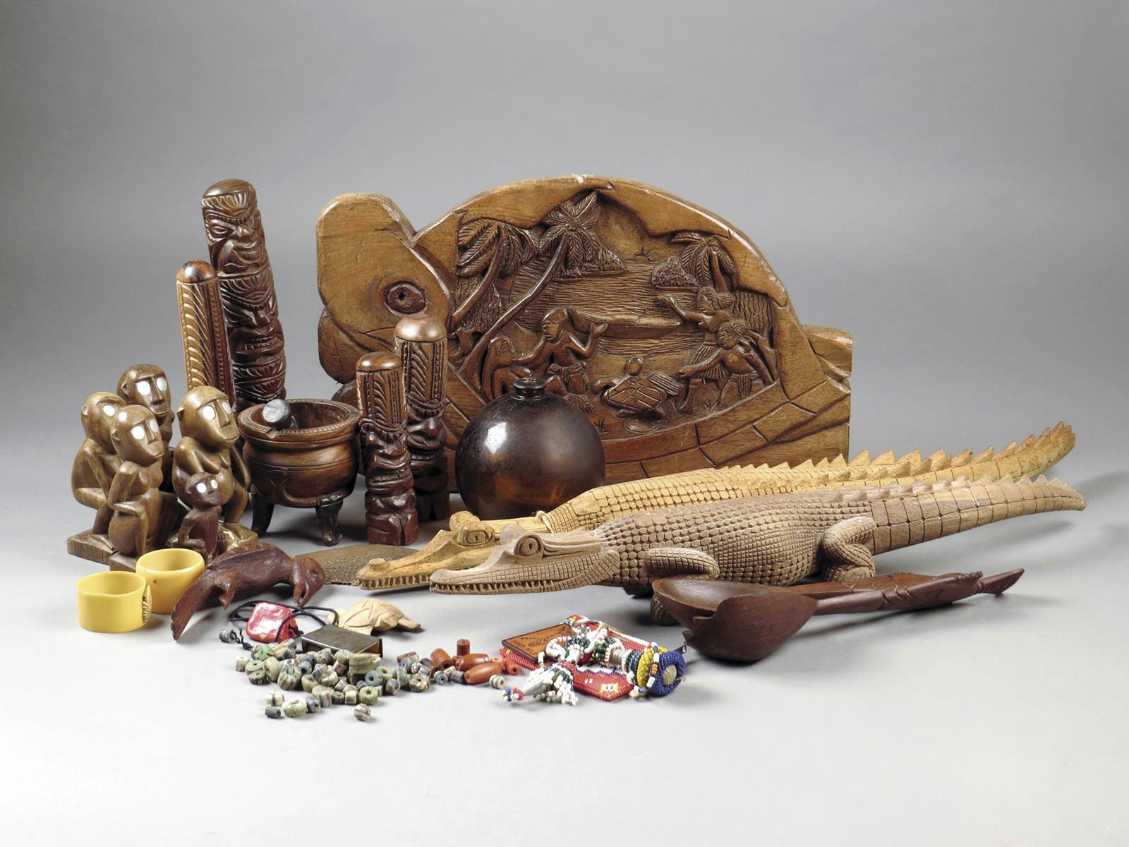 Two Manus Island carved wood crocodiles, Papua New Guinea, 53.5cm and 61cm long, other carved figures, a small group of Njigerian decorated beads, two wire and bead dolls. (a lot)