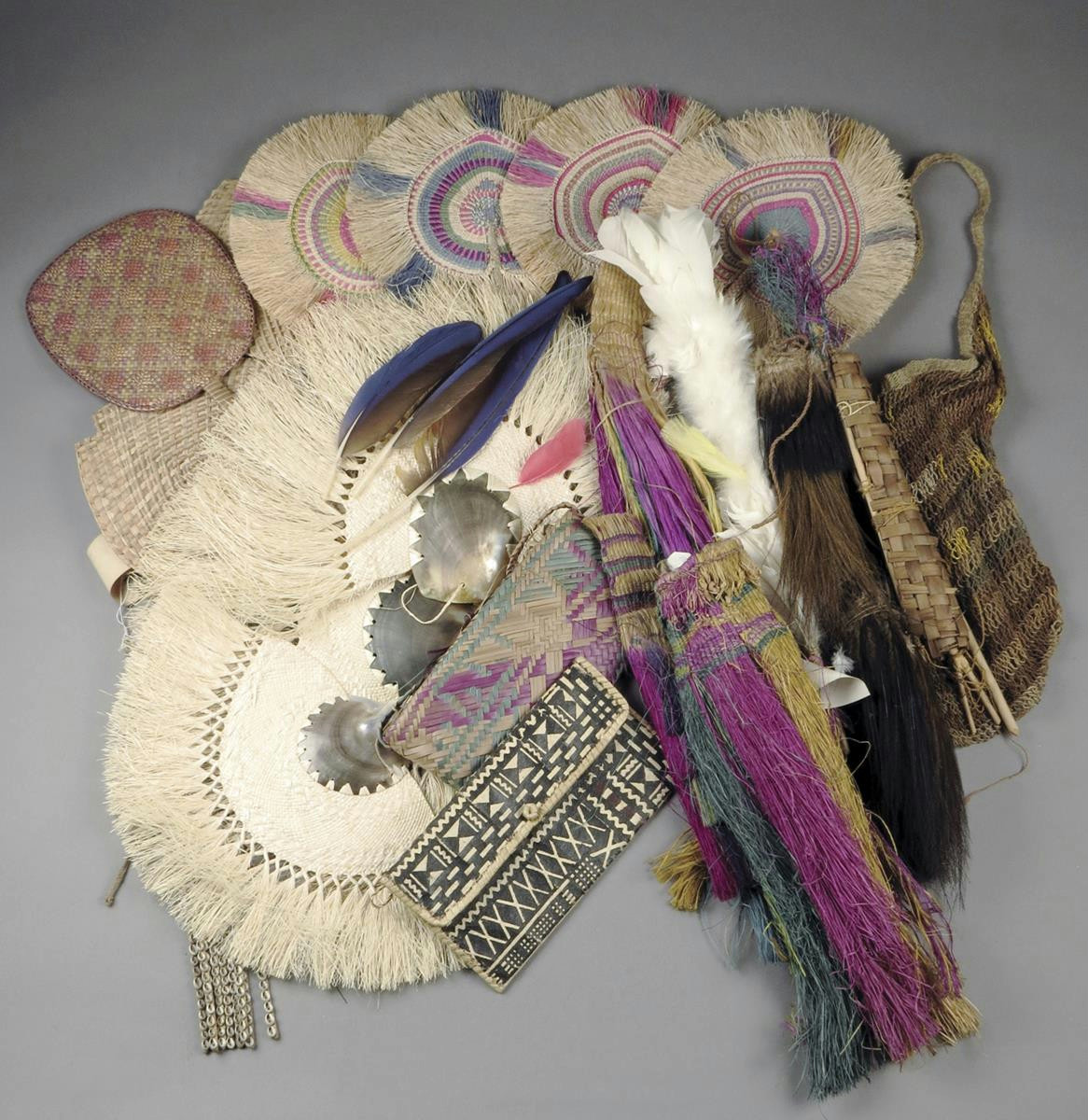A Dani fibre and nasa shell pendant, Papua New Guinea, 39cm high, three shell and woven fibre ornaments, seven hand fans, two feather ornaments, a fibre woven bag, a Kilenge woven bag, a tapa cloth and woven bag and various fibre costume ornaments. (a lot)