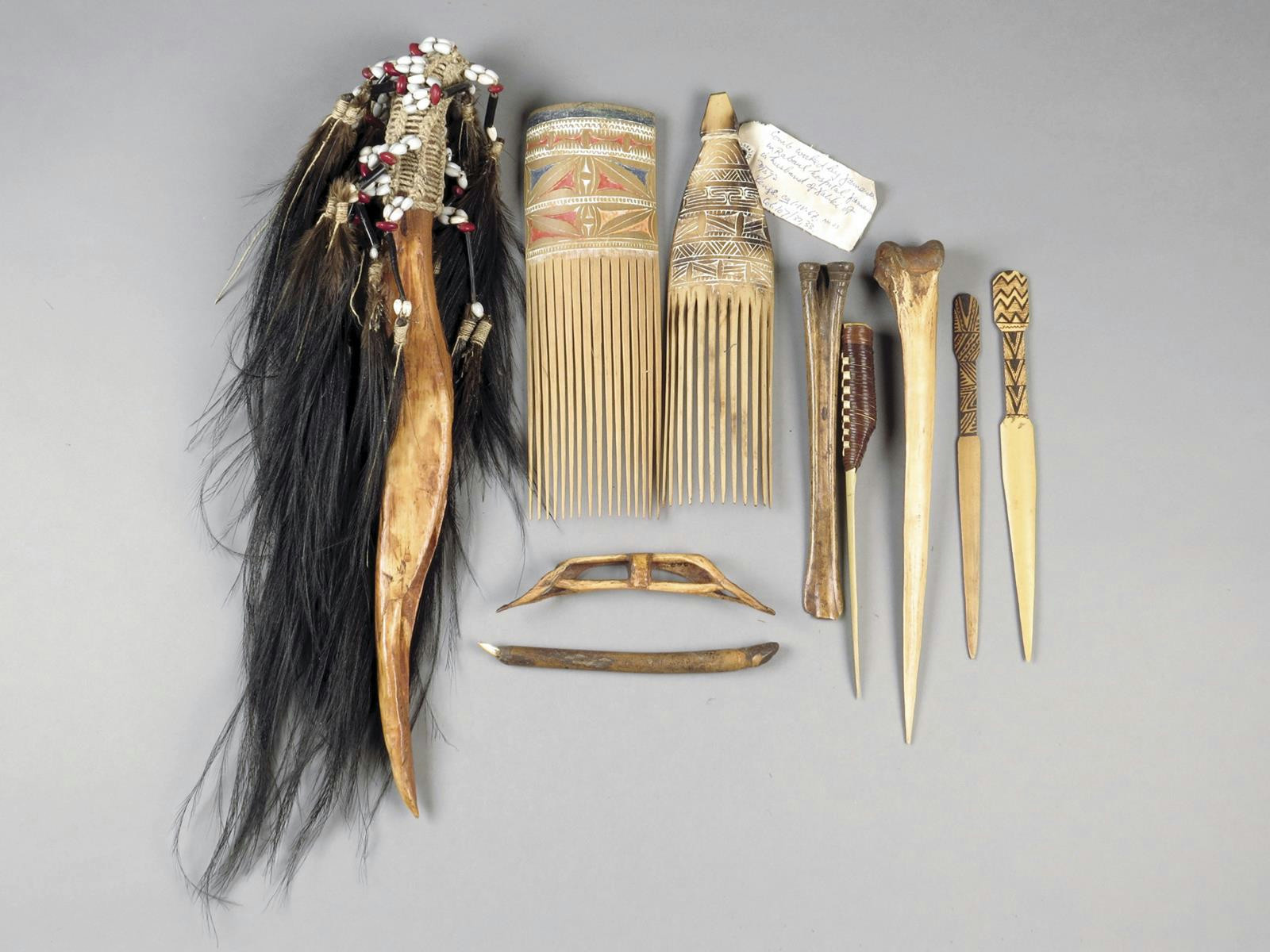 An Asmat bone nose ornament, Papua New Guniea, 15.5cm long, a Papua New Guinea bone dagger with cassowary feathers and beads, 45.5cm high, two bamboo combs with incised decoration, one with pigment, Kilenge and Kaliai, 25cm long, a bone dagger, a carved bone spatula, an engraver tool and three bamboo knives. (10)