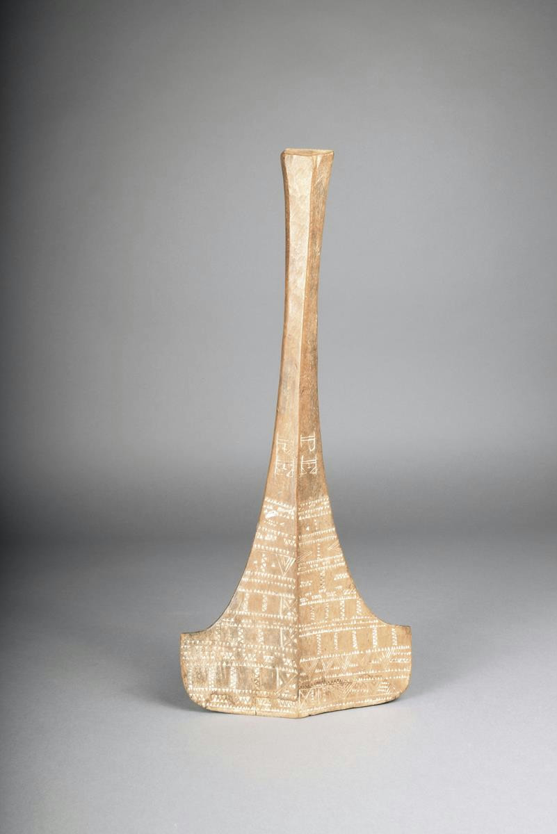 A Samoan club, Polynesia, of faceted hatchet form with incised decoration and initialed PE FE, lime filled, 49cm long.