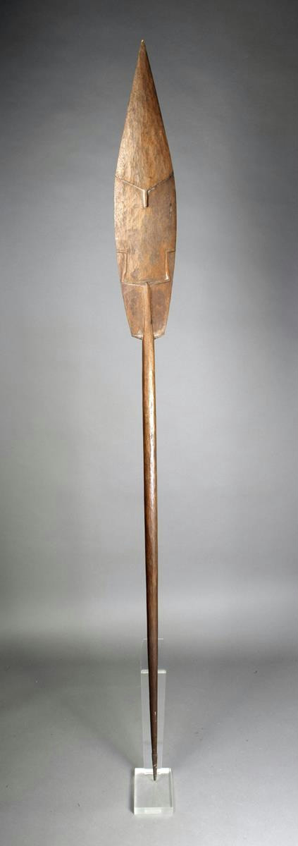 A Papua New Guinea paddle club, Melanesia, with a leaf shape blade with stylised relief carving, with a tapering shaft to a squared point, 180.5cm long.