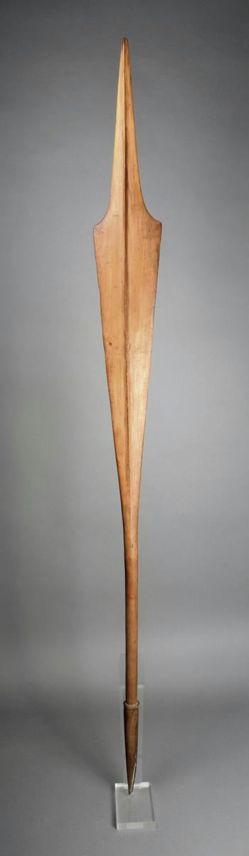 A Niue paddle, Polynesia, with a tapering shouldered blade with a medial ridge to the cylindrical shaft with a knopped and tapering faceted terminal, 184cm long.