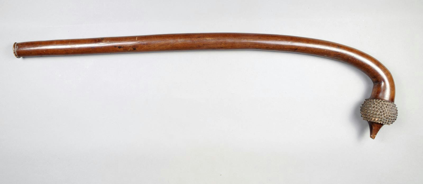 A Fiji totokia, beaked battle club, Melanesia, with a tapering point and seven rows of barbs, the cylindrical shaft with a flange butt, 93cm long.