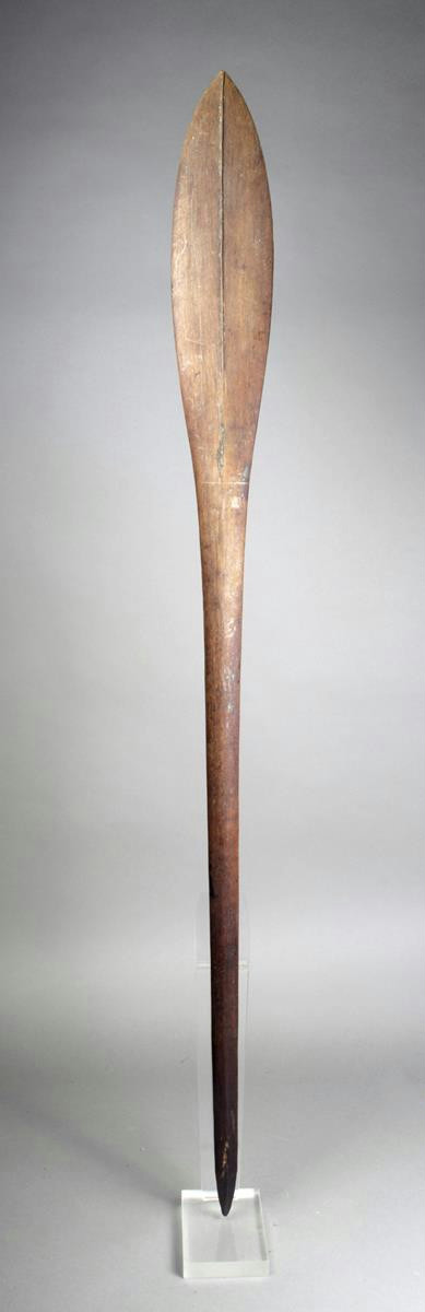 A Solomon Islands paddle club, Melanesia, with a leaf shape blade having medial ridges, with a tapering shaft and faceted point terminal, 133.5cm long.