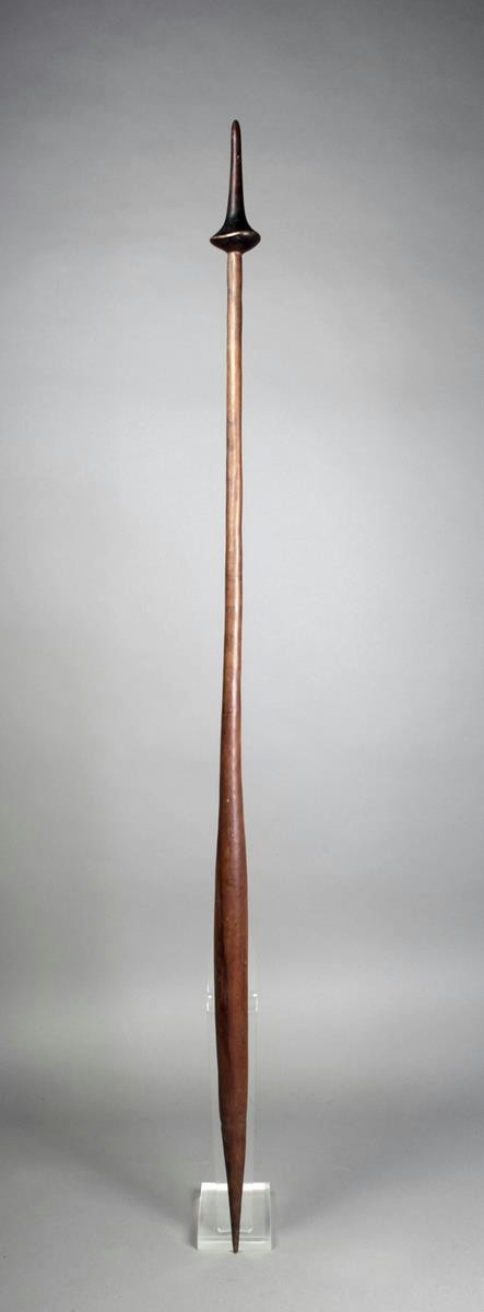 A New Britain club, Melanesia, of slender form with a slightly bulbous head and a knopped base with spike terminal, 144.5cm long.