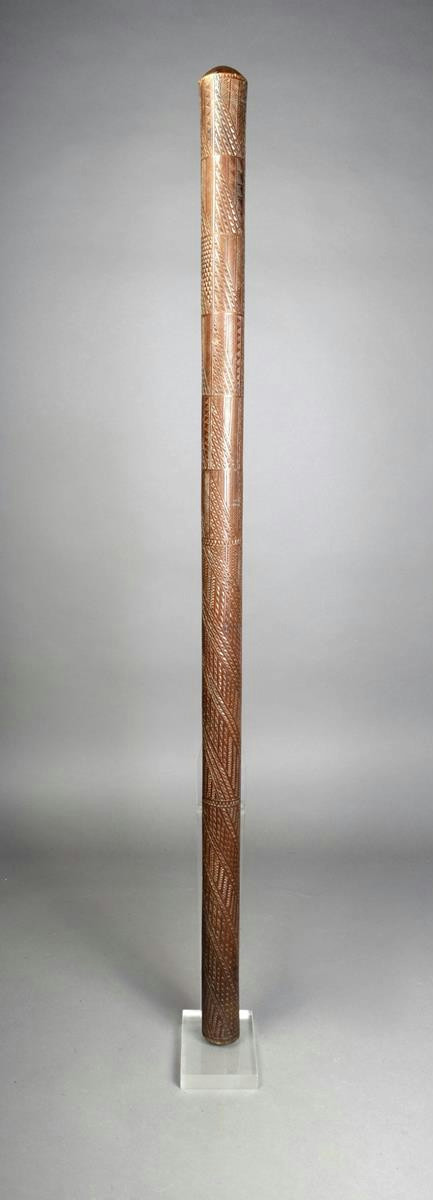 A Tonga pole club, Polynesia, all over carved geometric designs with a domed end, the butt with a shallow circular recess, 124cm long.