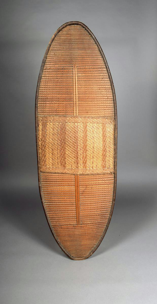 A Mongo shield, D R Congo, of eliptical form, bound reeds with panel front and wood block handle to the reverse, 120.5cm high.