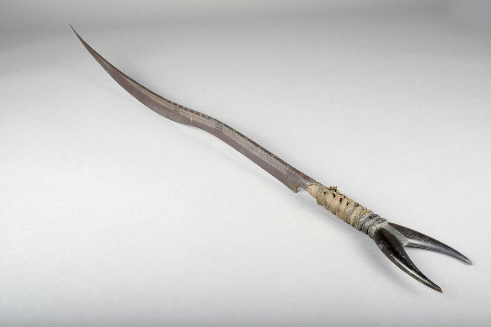 An African sword, with a shaped fullered blade with punched decoration, with a cloth bound wood grip and twin horn pommel, 79.5cm long.