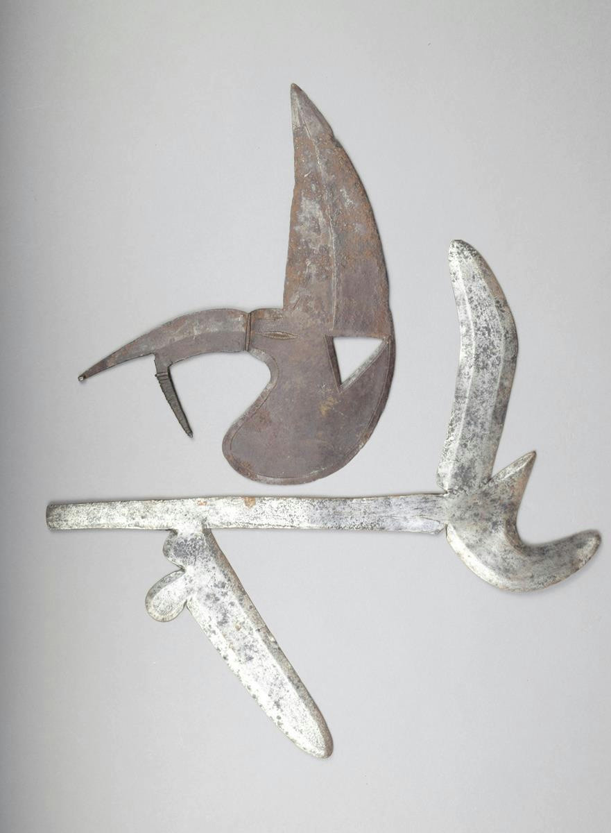 A Kota iron blade, of bird head form with incised decoration, 25cm high and a Congo throwing knife, 44cm high. (2)