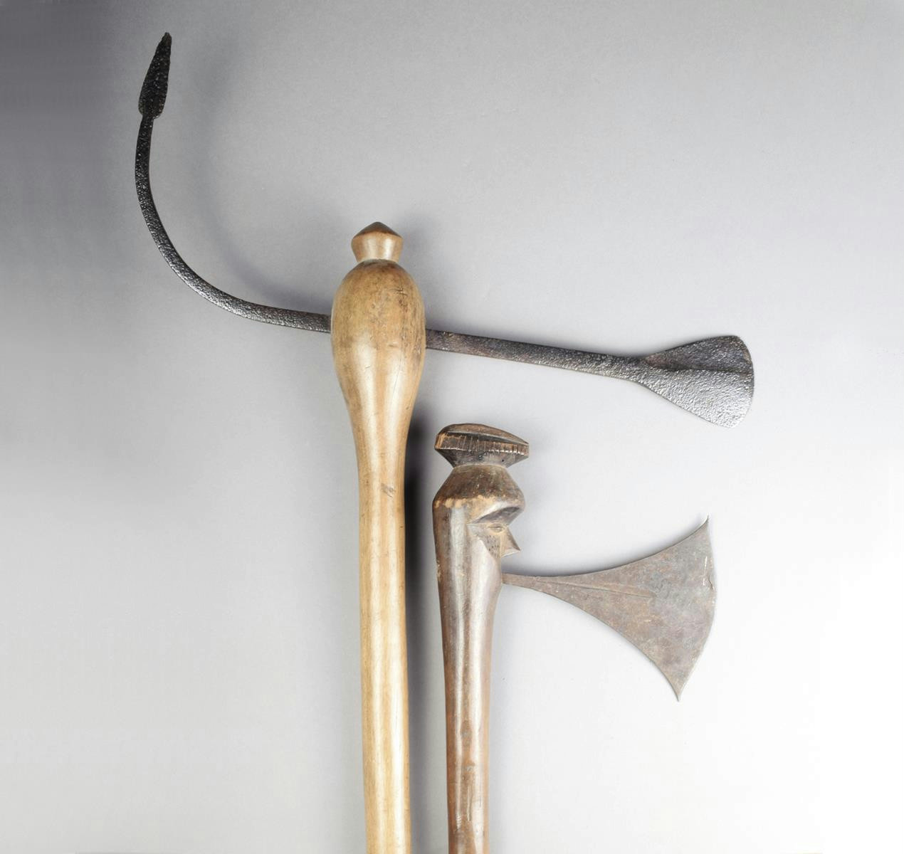 A Congo axe, with a flared iron blade, the wooden shaft with a carved head terminal with cresting, 42.6cm long and a wooden shafted axe with double ended blade, 81cm long. (2)