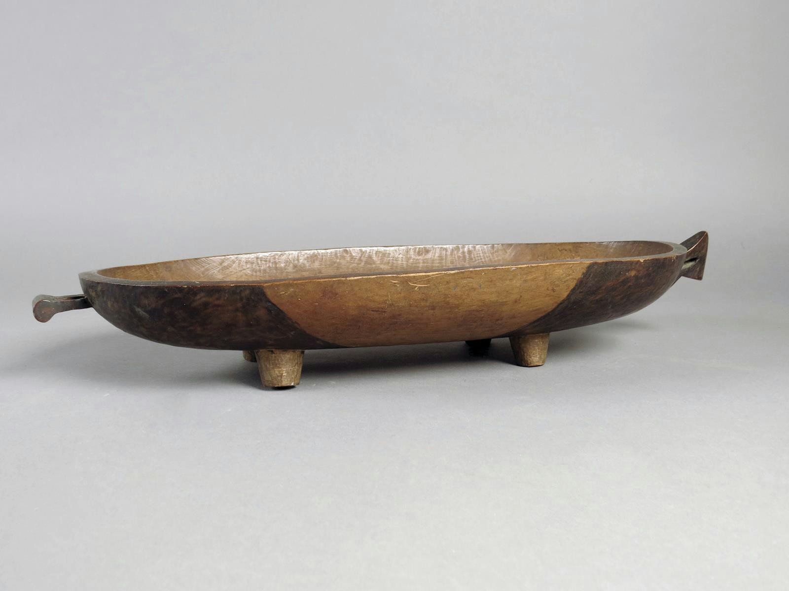 A Zulu meat platter, South Africa, oblong with differing pierced handle, the underside with scorched chevrons and four tapering feet, with remains of handwritten label 'Wilder,' 51.5cm long.