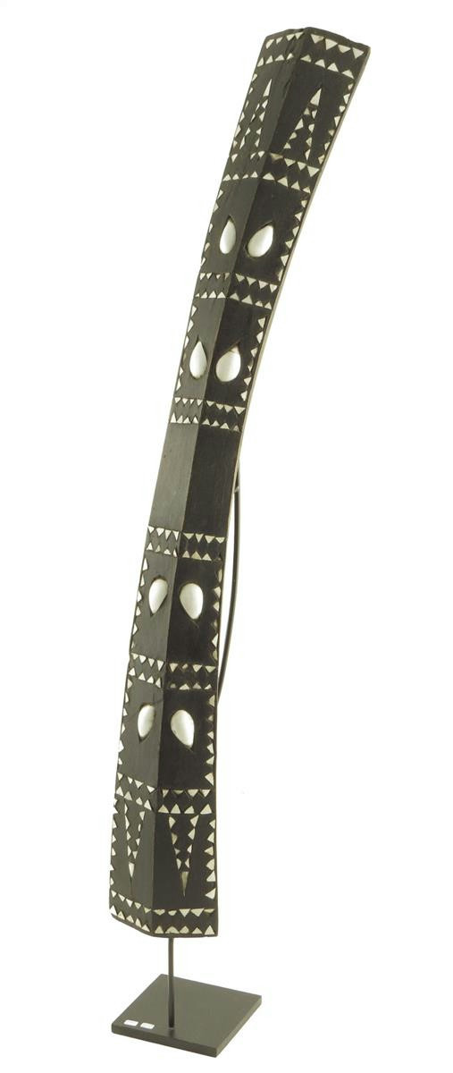 A Maluku shield, Indonesia, of curved angled form, inlaid shell, with integral handle, painted inventory number, 91cm high, on later stand.