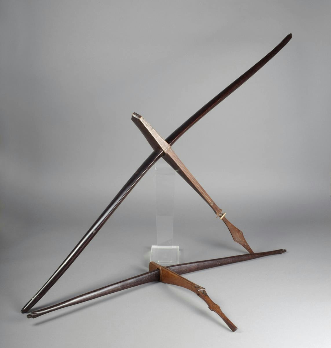 A Vietnamese cross bow, Montagnard Tribe, in two parts, the 'S' shape bow with carved ends with a fish-like body with a bone trigger, 69cm long, 127.5cm wide, and another smaller example, 44cm long, 95.5cm wide. (4)